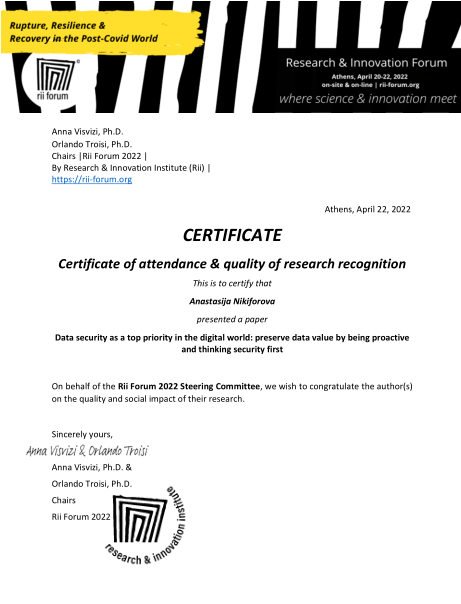 These were wonderful three days of the forum with very positive emotions and so many roles – panel organizer, speaker / presenter, program committee member and panel moderator with the cherry on the cake and such a great end of the event. Thank you Research and Innovation Forum!!! Even being at home and participating online, you managed to give us an absolute amazing experience and even the feeling that we were all together in Athens!