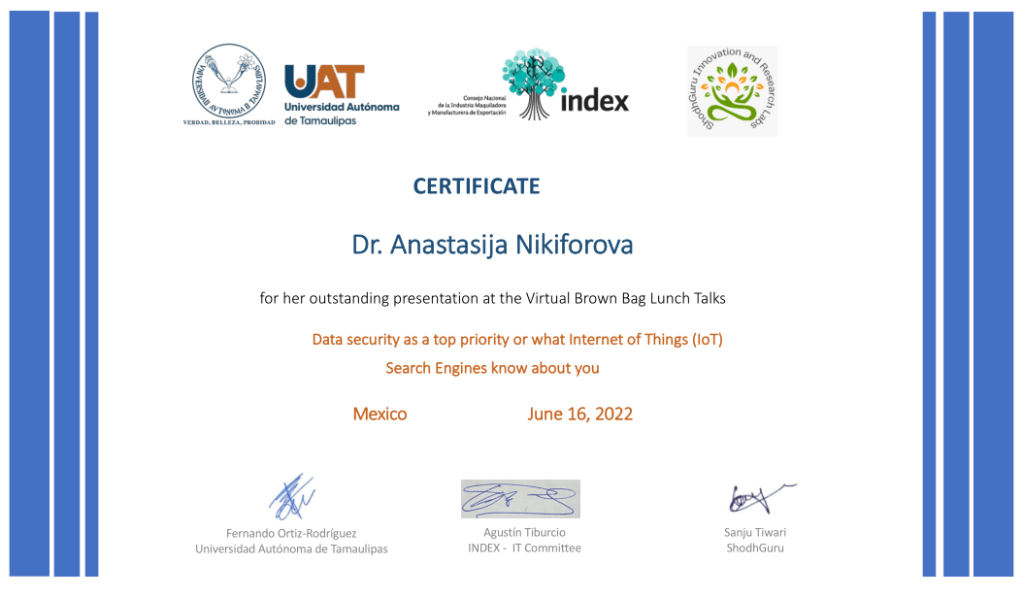 • “Virtual Brown Bag Lunch Talks” intended for the Information Technologies, Manufacturing, and Engineering Employees in Companies associated with Index Manufacturing Association, where I was invited to delivered a talk Data Security as a top priority or what Internet of Things (IoT) Search engines know about you“, which is based on several studies conducted by me before. Probably the most interesting point to be mentioned that this event was intended for Mexican audience, which was definitely something new for me. We had an exceptionally interesting discussion after my talk with representatives of the industry to whom these events are made, and I was super delighted to get so many positive comments, which definitely makes this event something to be in the list;