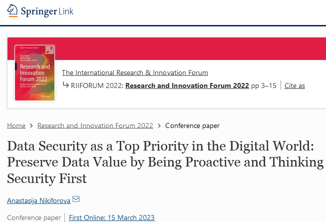 As you probably know from my previous posts, in 2022 I was honored to take part in The International Research & Innovation Forum, where I acted as both, as an author and presenter, panel organizer, session chair / panel moderator, and PC committee. What is more, I even was recognized as the best Best panel moderator award (you can read the post I dedicated to this experience here). Today, I am glad to reflect on the paper – Data Security as a Top Priority in the Digital World: Preserve Data Value by Being Proactive and Thinking Security First – I presented during this conference, which was just published by Springer as part of Part of the Springer Proceedings in Complexity book series (SPCOM).