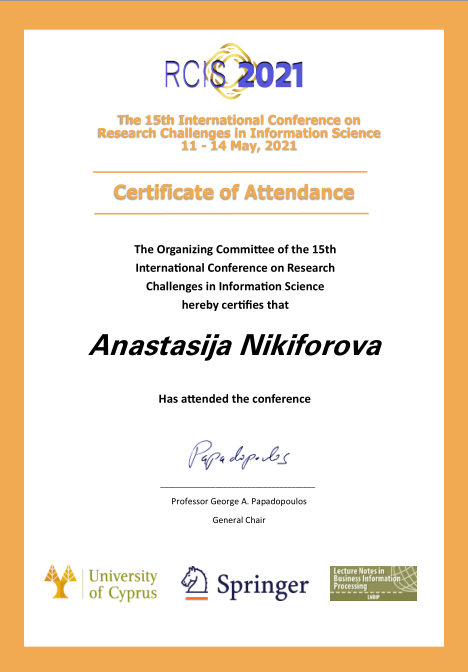 - 7 international conferences attended as a speaker with 5 papers, 2 posters, 2 more talks on the results of ongoing projects and 1 invited talk. Thank you RCIS (International Conference on Research Challenges in Information Science), ICEGOV (International Conference on Theory and Practice of Electronic Governance “Smart Digital Governance for Global Sustainability“), IDSTA (International Conference on Intelligent Data Science Technologies and Applications), IoTSMS (International conference on Internet of Things, Systems, Management and Security), EBW (European Biobank week), International Conference and Expo on Nanotechnology and Nanomaterials – it was a really great experience, and it is great that, despite the pandemic, you have managed to organize such great events with such a nice audience and brilliant speakers (both participants and keynotes).